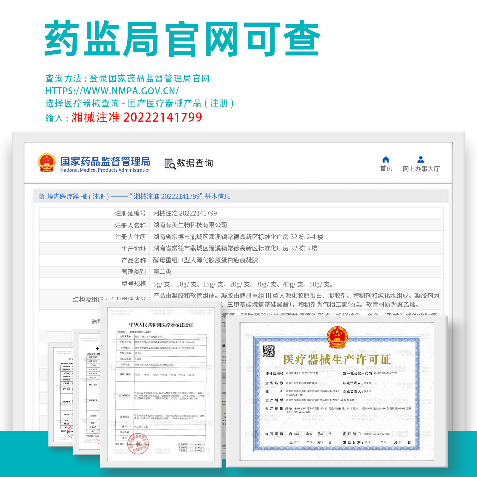 | 组成成分 | 产品由凝胶和软管组成。凝胶由酵母重组Ⅲ型人源化胶原蛋白、凝胶剂、增稠剂和纯化水组成。凝胶剂为硅酮凝胶(二甲基硅氧烷、三甲基硅烷氧基硅酸酯),增稠剂为气相二氧化硅。软管材质为聚乙烯。 |
