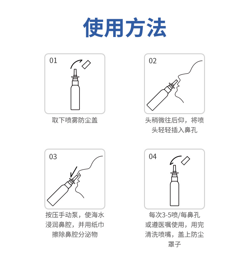 | 组成成分 | 产品由天然海盐、纯化水和包装容器组成;包装容器由铝或聚乙烯材料制成的喷雾瓶或冲洗瓶,以及聚乙烯材料制成的冲洗头(含保护盖)组成。 |