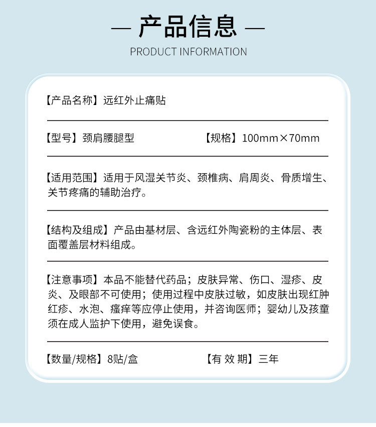 | 组成成分 | 该产品由基材层、含远红外陶瓷粉的主体层、表面覆盖层材料组成。 |