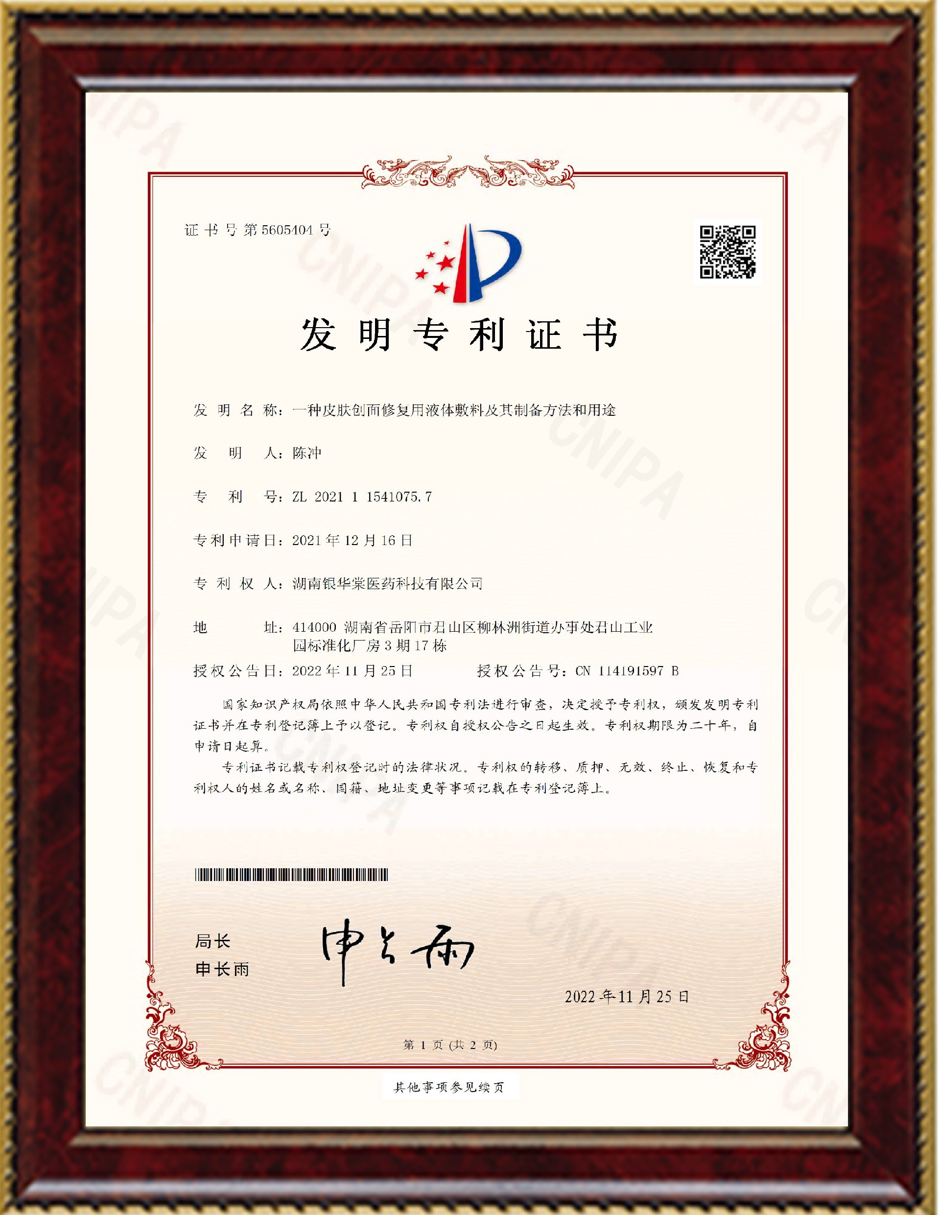 聚焦产品创新,引领行业发展,热烈祝贺银华棠自主研发的《一种皮肤创面修复用液体敷料及其制备方法和用途》获得国家发明专利。