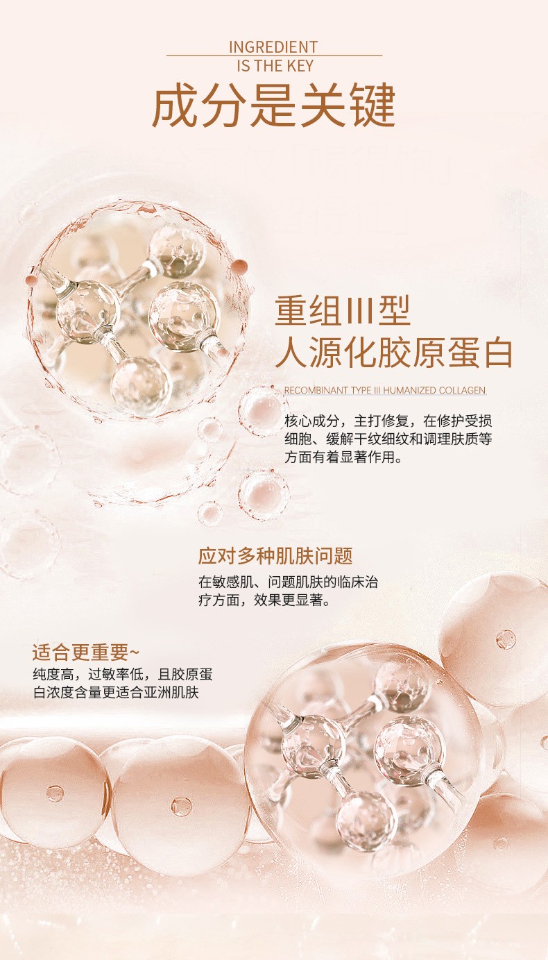 | 组成成分 | 产品由重组Ⅲ型人源化胶原蛋白、D-(+)-海藻糖二水合物、甘油、卡波姆、丁二醇、三乙醇胺、纯化水和塑料管(或塑料瓶、玻璃瓶、铝瓶、铝塑膜袋)组成,产品经辐照/湿热灭菌,无菌供应。 |
