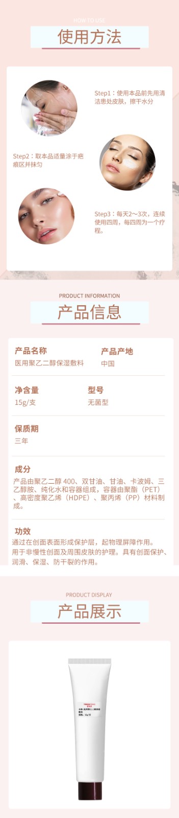 | 组成成分 | 产品由聚乙二醇 400、双甘油、甘油、卡波姆、三乙醇胺、纯化水和容器组成,容器由聚酯(PET)、高密度聚乙烯(HDPE)、聚丙烯(PP)材料制成。 |