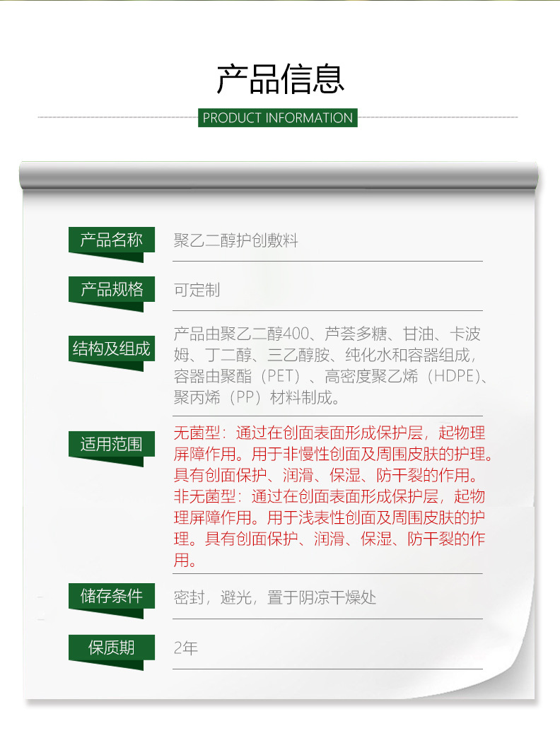 | 组成成分 | 产品由聚乙二醇400、芦荟多糖、甘油、卡波姆、丁二醇、三乙醇胺、纯化水和容器组成,容器由聚酯(PET)、高密度聚乙烯(HDPE)、聚丙烯(PP)材料制成。 |