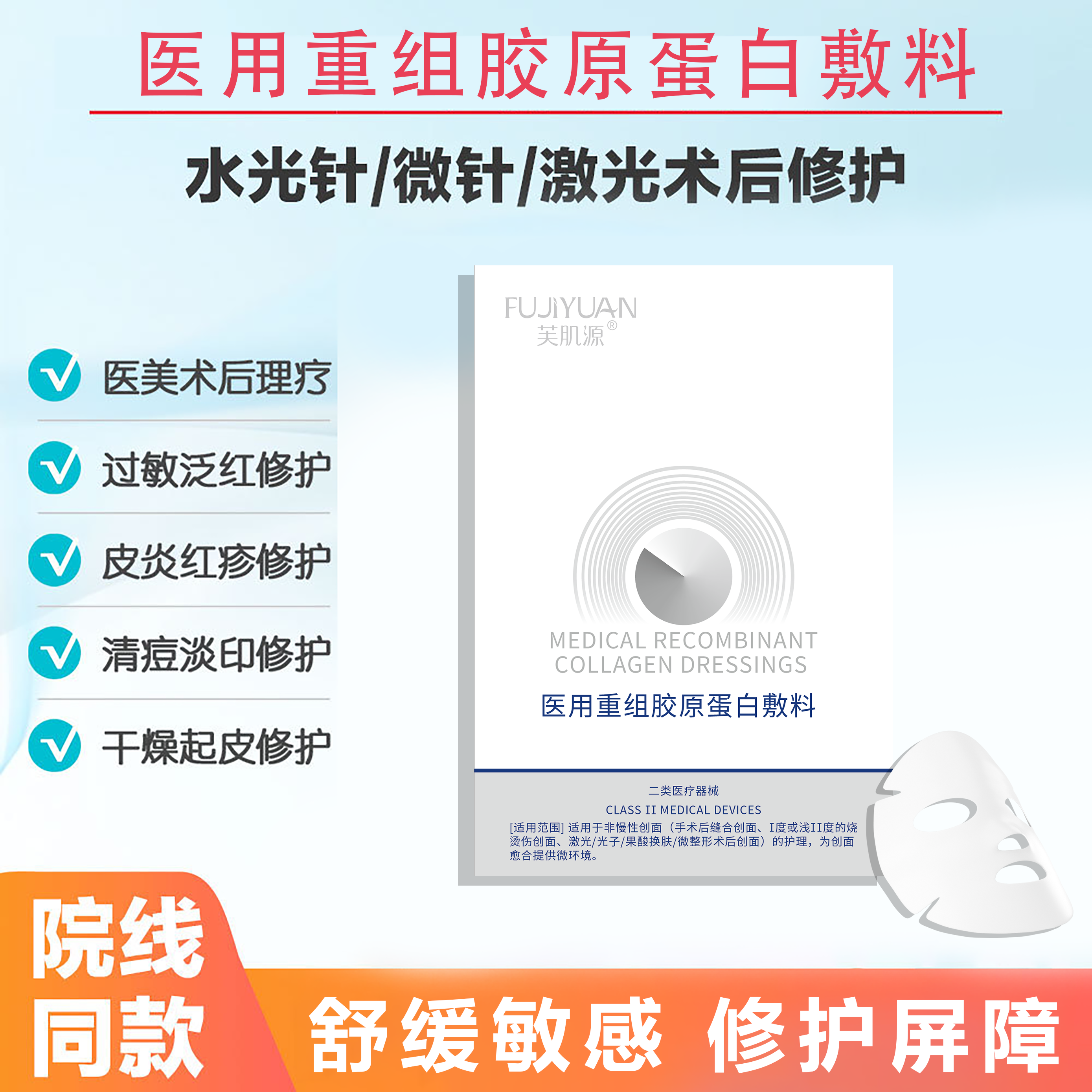 | 组成成分 | 本品由胶原蛋白溶液(重组胶原蛋白、甘油、对羟基苯甲酸甲酯、纯化水)和基材无纺布组成。产品经辐照灭菌,无菌供应。 |